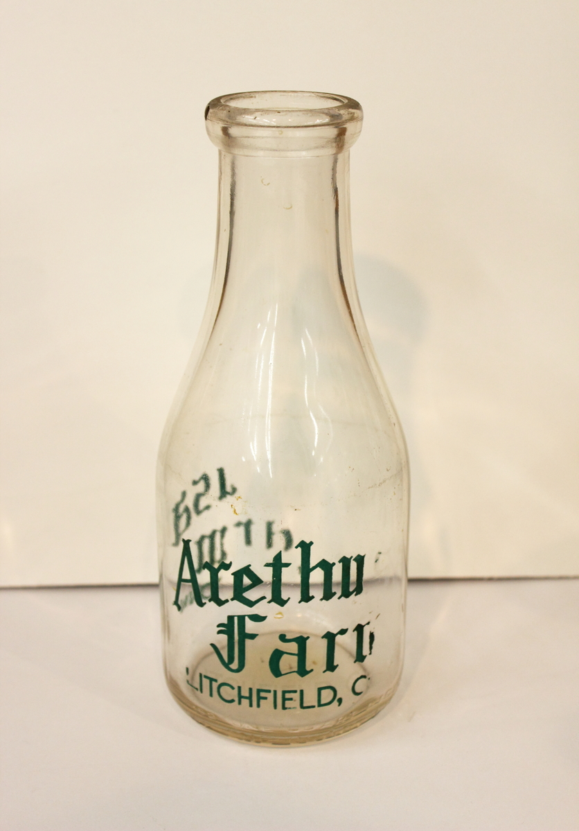 Glass milk bottle with round lip top, circular bottom, and tapered sides. One quart. Printed lettering on front and back, in green, "Arethusa Farm/LITCHFIELD, CONN."