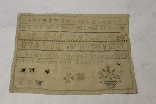 Marking sampler worked by Martha Ann Beecher. Silk thread on linen ground. Sampler features six rows of alphabet and numbers, including capital and cursive letters. Sampler is marked Martha Ann Beecher, with no date. Snowflake motifs, shapes, and an urn of flowers underneath.