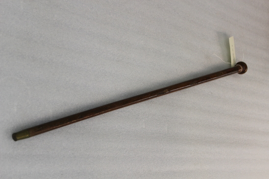 Cane of slightly tapered wood shaft; rounded handle of lighter wood with a missing inlay piece; grooved brass tip.