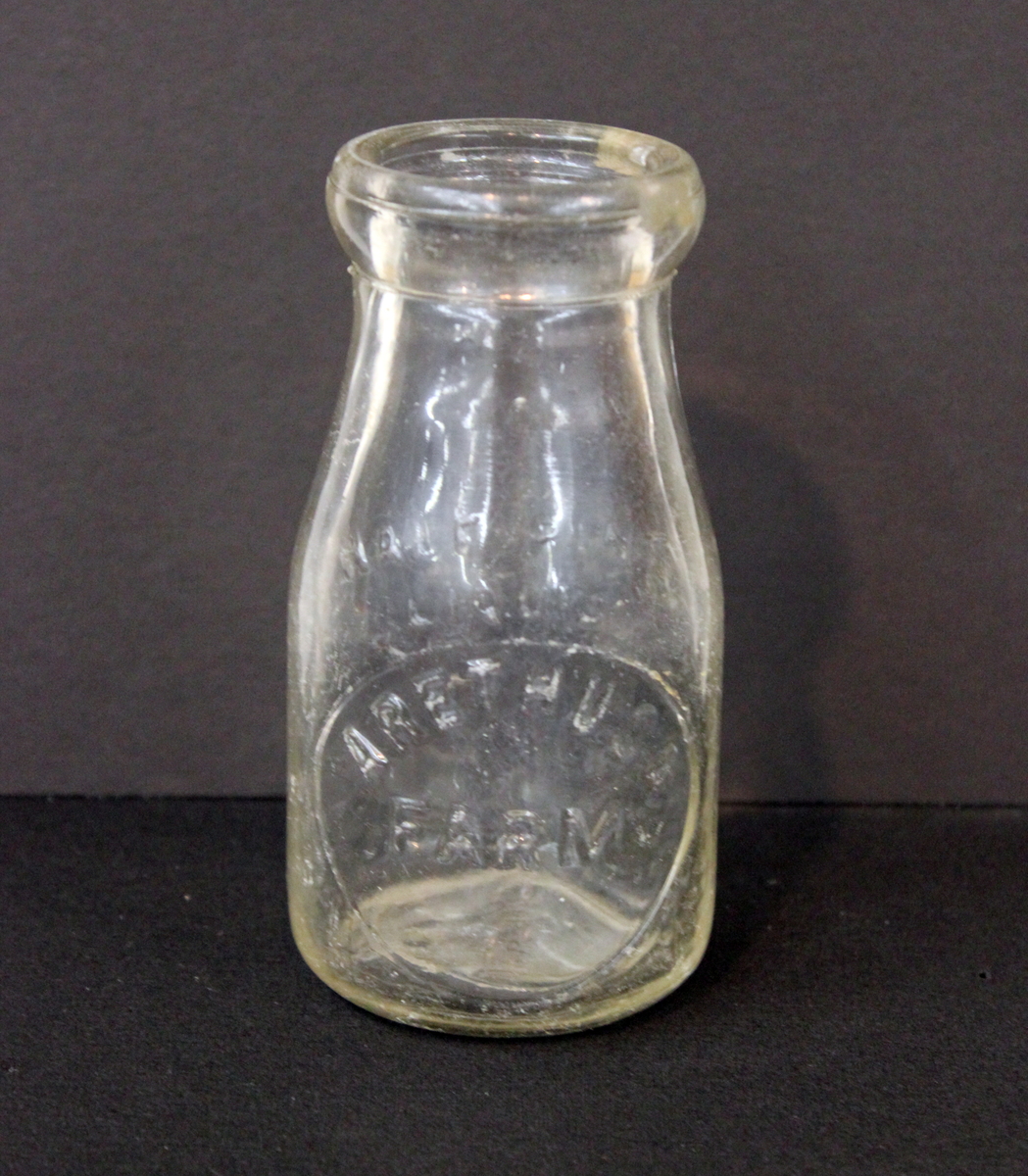 Glass milk bottle with round lip top, circular bottom, and tapered sides. Half pint. Embossed lettering on front within circle, "ARETHUSA FARM"; embossed above "HALF PINT/LIQUID." Circular mark on bottom with embossed lettering, "T. MFG.CO."