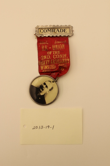 Three piece G.A.R. reunion medal. Silver metal bar pin at top with "COMRADE" label. Silk ribbon with gold printing: "52ND ANNUAL / RE-UNION / OF THE / 2ND CONN. / HEAVY ARTILLERY / WINSTED, / CONN. / SEPT. 11, 1917." Ribbon gathered into a loop with a suspended button with a black and white photograph of a mustachioed man in a dark suit, the commander of the G.A.R. unit at the time of issue.