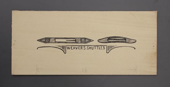 Illustration on board executed in pencil and black paint. Artwork depicts two types of weaver's shuttles shown side by side.