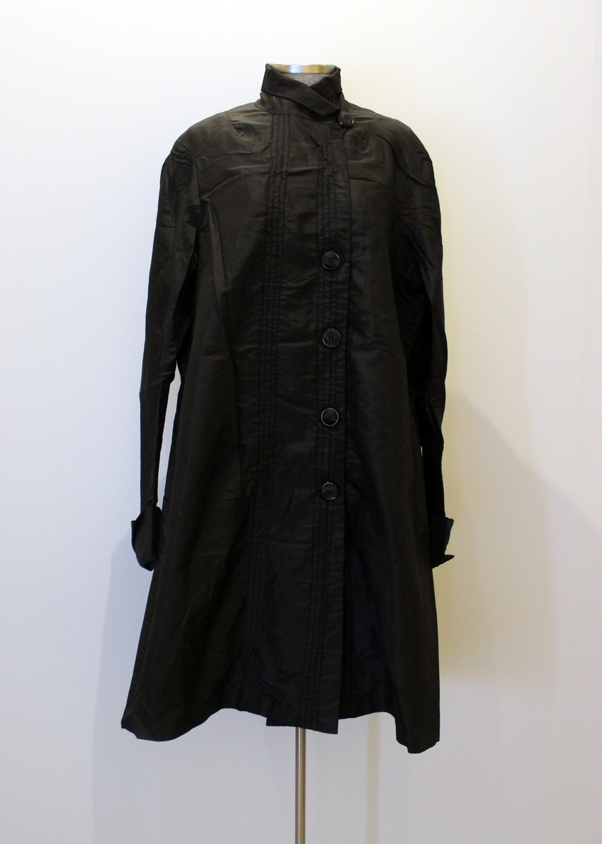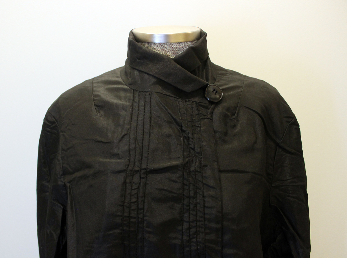 Black silk taffeta women's jacket. Center-front opening with tucks and five large buttons for asymmetrical closure. Rolled moiré collar. Tucks at back. Long sleeves with folded back moiré cuffs. No lining.