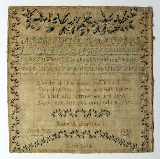 Sampler worked in silk thread on linen. Sampler features upper and lower case alphabet in green at top with a verse in brown stitched in center reading, "Lovely girl too soon you'll find/ Your happiest days are left behind/ To grief and sorrow we are born/ Each rose we see conceals a thorn." Sampler is signed in brown, "Mary A. Merriman/ Oct 10/ 1835/ Litchfield" at bottom. A green, cream, and brown floral vine border sampler.