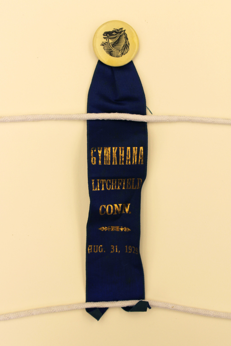 Rectangular ribbon of blue satin with notched bottom. Ribbon is bunched at top, where it is attached to a round metal button. Button has a white face with black printed image of a horse's head; straight pin on reverse. Printed on one side of ribbon in gold lettering, "GYMKHANA/LITCHFIELD/CONN./AUG. 31, 1929."