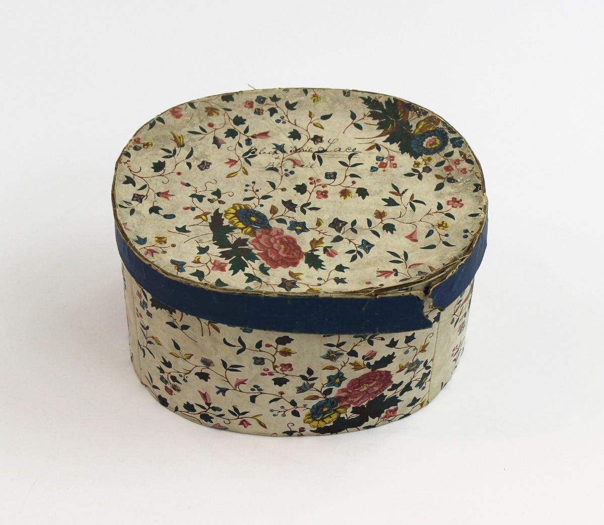 Oval board box covered in block printed wallpaper. Design features pattern of large and small flowers in yellow, blue, and pink on vines of green and brown; white background. Rim of lid has solid blue paper. Box sewn together.