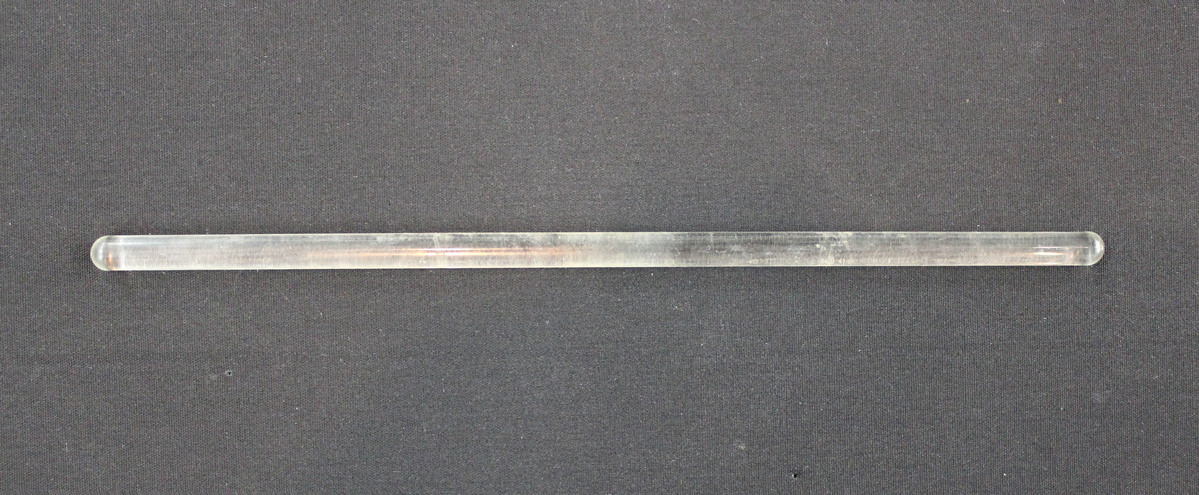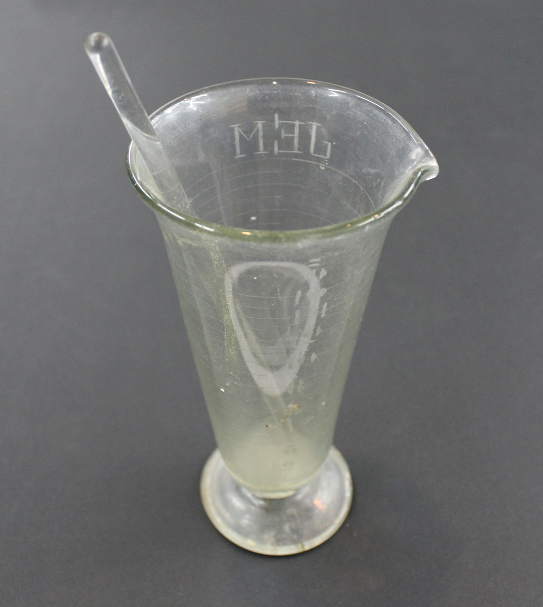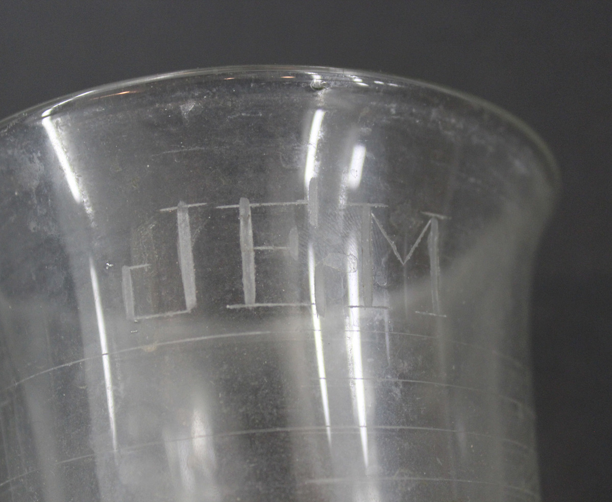 Glass conical measure (a) for pharmaceutical use. Glass cylinder with flared rim and small spout, tapering towards bottom where it connects to a round glass base. Graduated measurements engraved on one side, 0-16 ounces, with every other line extending around the measure and the others extending halfway around. Engraved monogram on reverse side, "JEM" (Joseph E. Murphy). On side opposite spout are two stamps listing manufacturer and industry approvals. Stirring stick (b) of solid glass, rounded at each end.