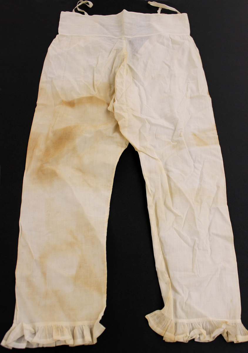 White cotton children's (boy's) long underwear. Waistband with tape straps and ties for closure. Open at center-back down to crotch. Sheer cotton ruffles at bottom.