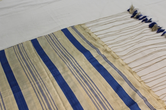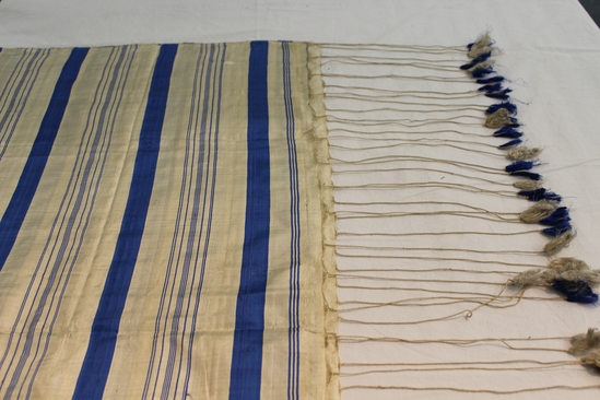 White silk square scarf with broad and narrow stripes in royal blue. Fringe of cording with blue and white tassels on two sides.