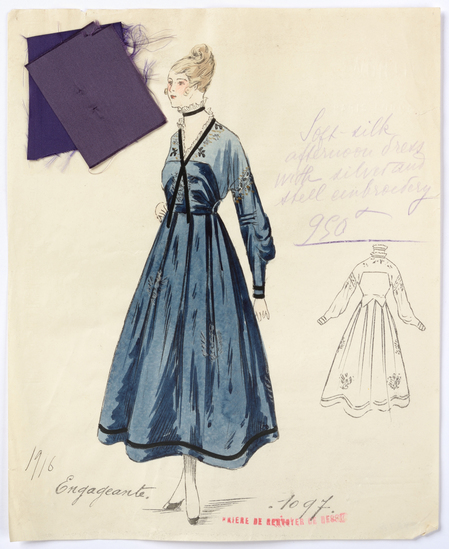 Lithograph and watercolor on paper fashion design. Soft silk afternoon dress with silver and steel embroidery. Fabric samples accompany rendering.