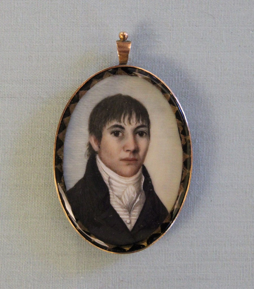 Watercolor on ivory portrait miniature of an unidentified young man by Anson Dickinson. Bust portrait of a young man wearing a black jacket with a textured white vest and a white stock tie. The man has brown hair and brown eyes. Facing front right against a background of blue and white. Oval portrait with a black and gold eglomise set in a metal oval locket under convex glass, with loop at top. B - Original broken glass with black and gold eglomise.