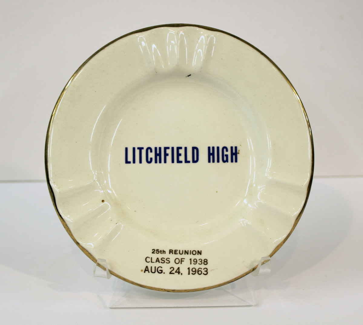 White Plate/ ashtray with gold edge, molded "ring" base, and three molded indentations to rest a cigarette. On center front lettering in royal blue: "LITCHFIELD HIGH" and at center bottom lettering in gold: "25th REUNION/CLASS OF 1938/AUGUST 24/, 1963". Back has lettering in brown: "THE/"SABINA"/LINE/Warranted 22k/Made in U.S.A"