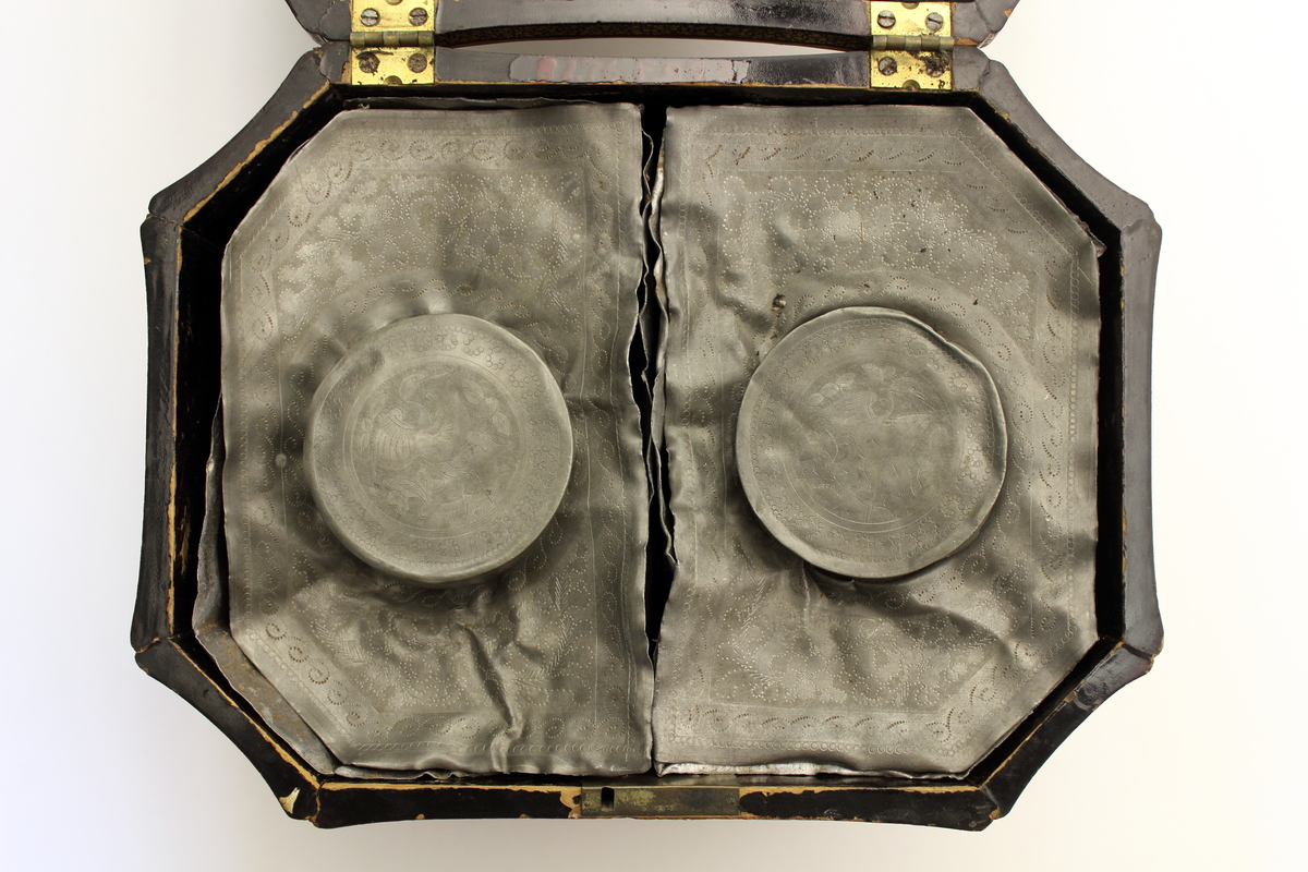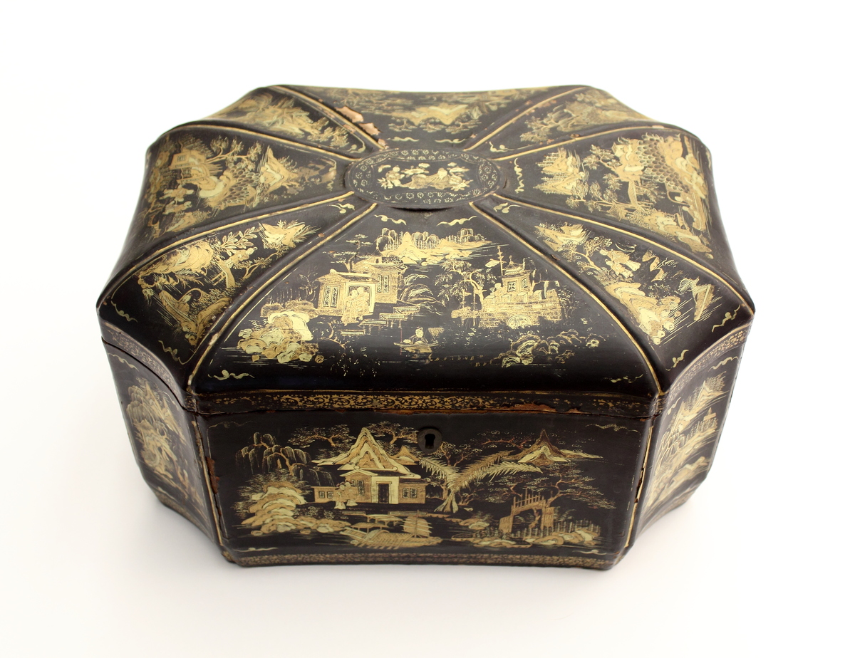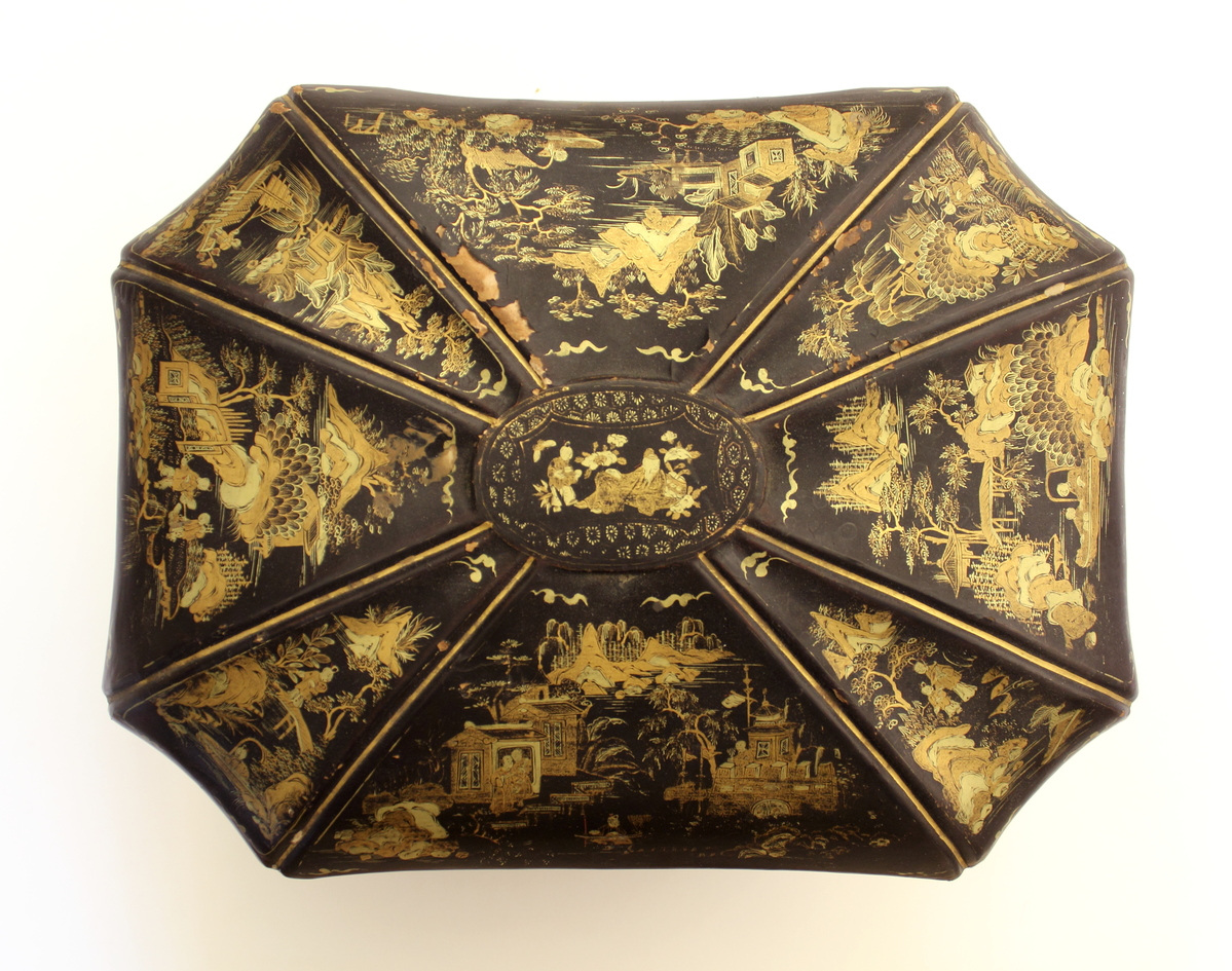 Lacquered wood with iron lock in front and brass hinges in back. Flat black lacquered bottom and interior. Octagonal paneled sides and swelled top centering on oval panel. Gilt painted Chinese landscapes on all panels (two tone gold) Floral repeat board on edge of top. Interior divided into two equal containers of soft lead with smooth sides now bent and tops pulled off having punched or pressed work oriental floral/geometric design on top. In center of top is raised collar on one with two round canister tops having stork and geometric punch or engraved design. One canister seal and inner lid with wooden knob included.