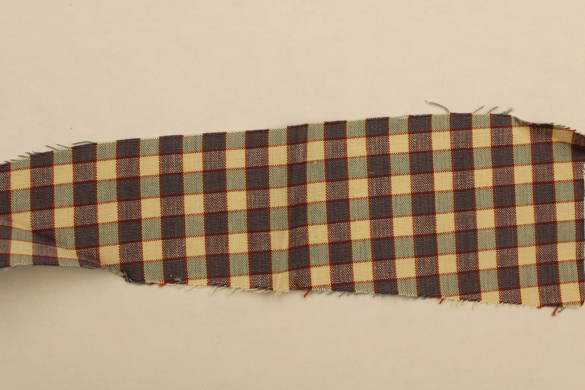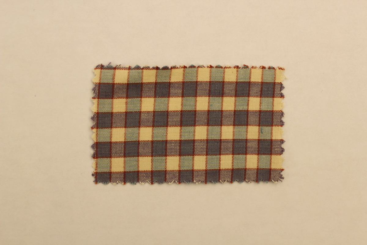 Rectangular fabric swatches made of cotton. Checkerboard pattern of blue and white squares. Each horizontal row of boxes alternates between a dark blue and a white row. Each vertical row of boxes alternates between a light blue and a white row. Each box is outlined in a red line. Fabric has a fairly open weave and is rough to the touch.