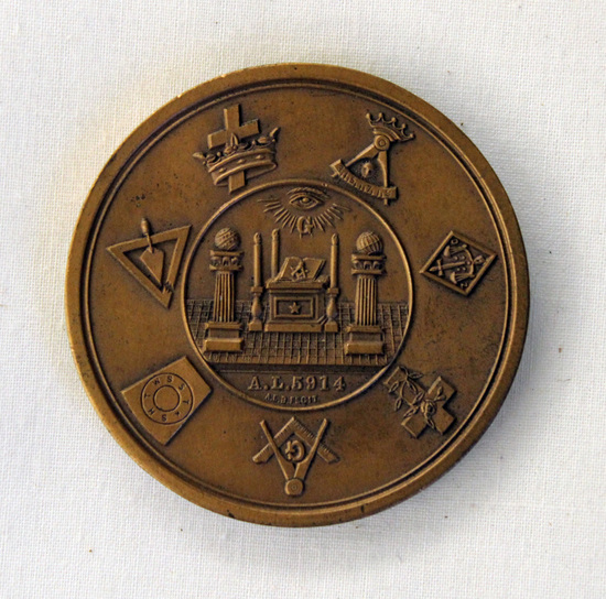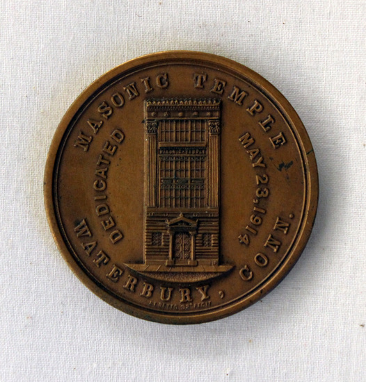 Round bronze Masonic medal. Picture of a Masonic temple stamped in center of one side. 'MASONIC TEMPLE / DEDICATED / MAY 23, 1914 / WATERBURY, CONN" stamped around picture of building. Reverse side stamped with design showing a Masonic altar with various Masonic symbols surrounding it. "A.L. 5914" below altar. Round flat green cardboard box to hold the medal.
