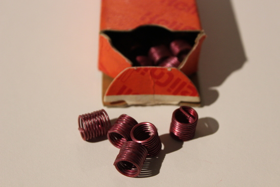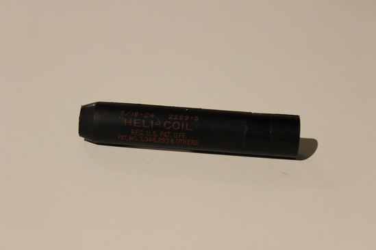 a: Box of 20 Heli-Coil insets. Orange cardboard box marked with HeliCoil logo and handwritten product information on top flap. Box reads "Heli-Coil Inserts/Size 5/16 - 24/P/N 3591/ Lenth 5CNx-469/Qty 24/Control No. 63073." Box contains 20 individual inserts, each 3/8" long and made of stainless steel wire coiled in a cylindrical tube. b: Black plastic tool for inserting Heli-Coil inserts. Plastic tube with openings at both ends, one of which tapers slightly and is threaded to fit the insert. 1" opening in tube just above the tapered end. Marked "5/16 - 24/2299-5/Heli-Coil/Reg. U.S. Pat. Off./Pat. No. 3,348,293 & Others."