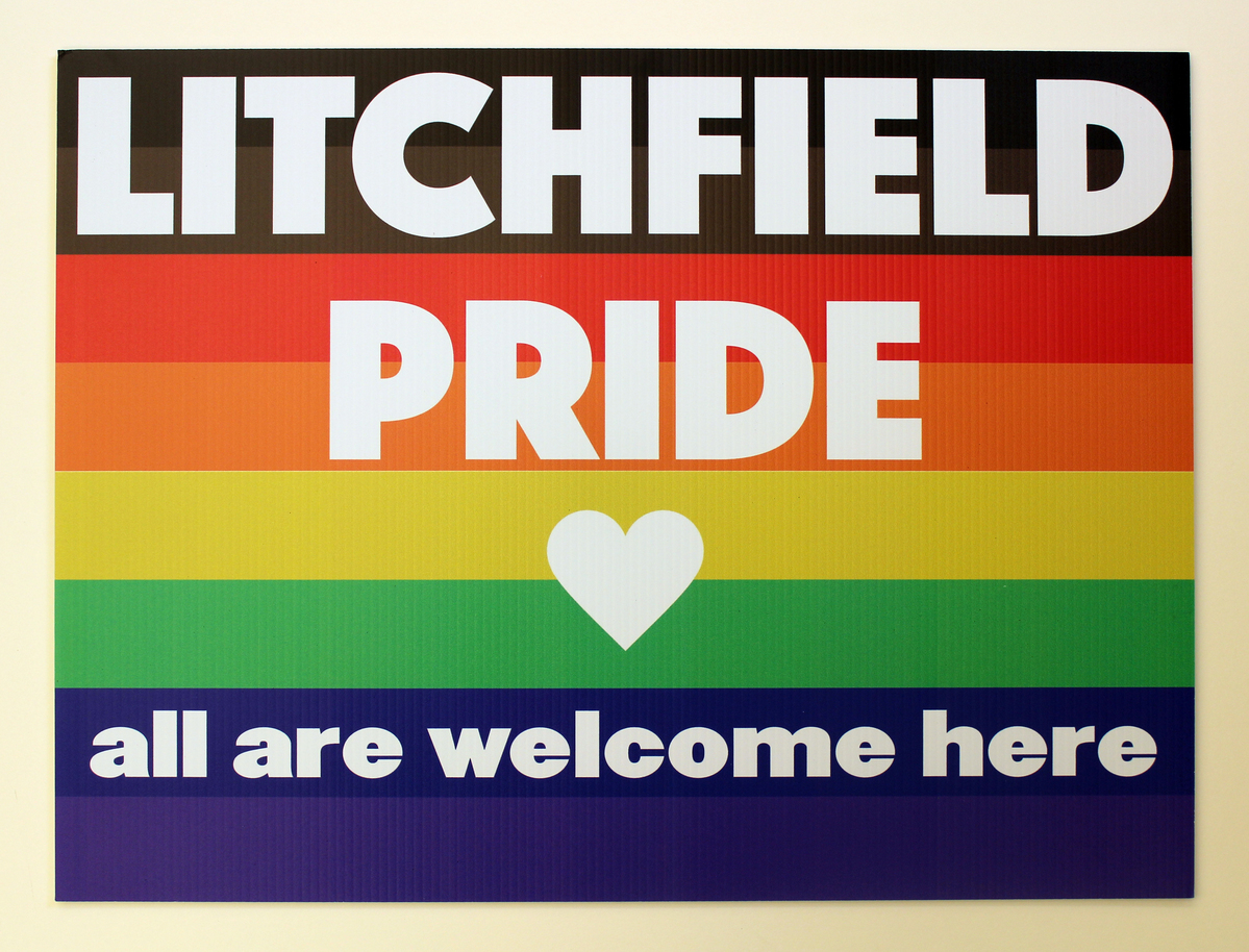 Printed lawn sign on corrugated plastic. Two-sided graphic with background of black, brown, red, orange, yellow, green, blue, and purple horizontal stripes. White text overlapping background, "LITCHFIELD/PRIDE/all are welcome here" separated by a white heart.