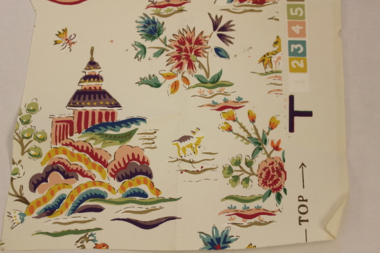 Rectangular wallpaper sample with white background and pink, purple,blue, organ, yellow, and green floral pattern. A pink and purple pagoda is also visible, with pink, purple, blue, yellow, and orange hills underneath. Pattern of animals throughout.