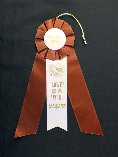 Nation Council of State Garden Clubs, Inc. ribbon. Brown rosette and tails with white button inside rosette stamped in gold, "EDUCATIONAL EXHIBIT" and a center white tail stamped in gold with seal of the National Council of State Garden Clubs and "FLOWER SHOW AWARD." Award and judge information written on reverse of button.