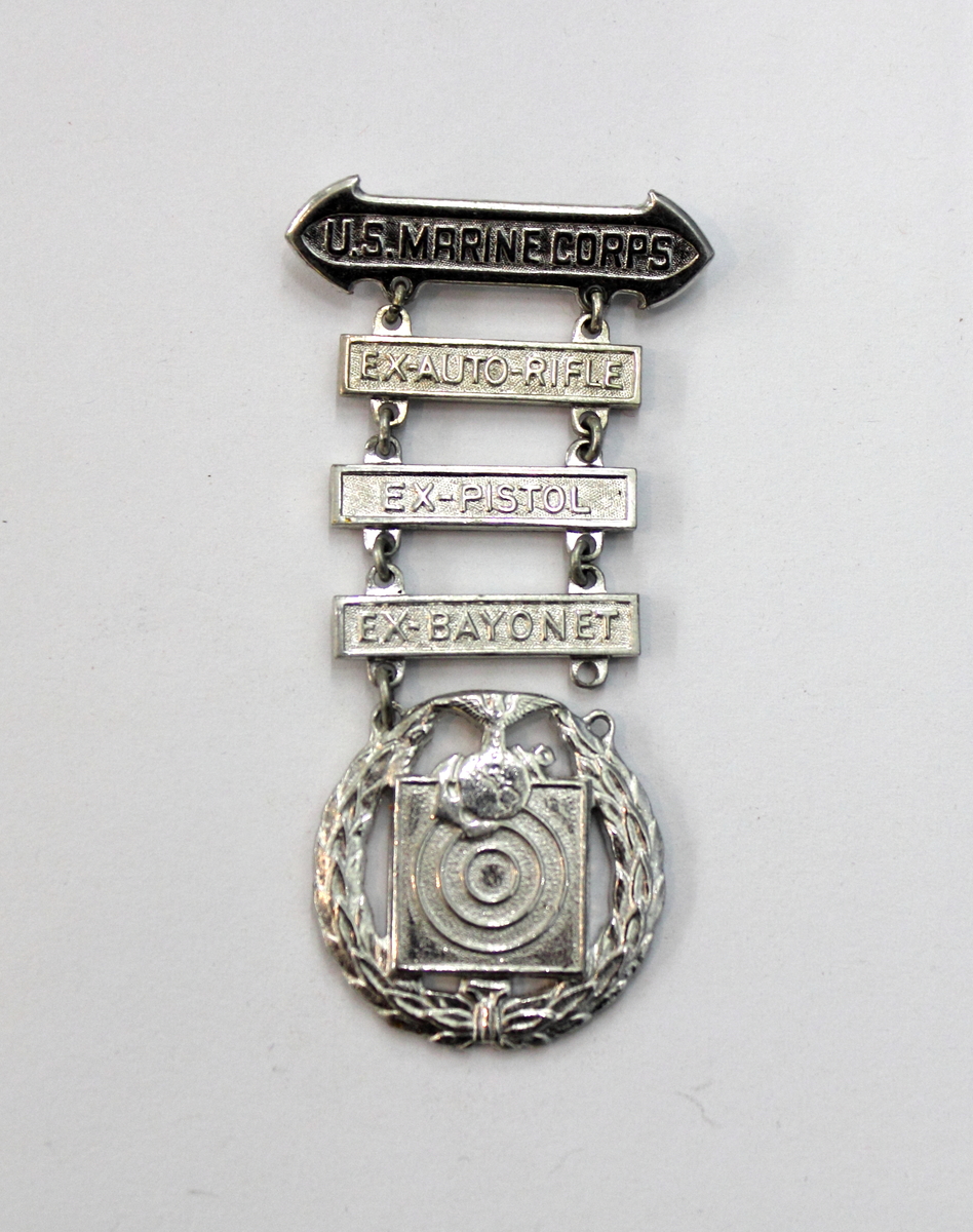 USMC expert qualification badge with three qualifications, World War II era. Four badges connected vertically by rings to a metal brooch. Brooch has raised lettering "U.S. MARINE CORPS". Attached below brooch is rectangular badge with raised lettering "EX-AUTO-RIFLE". Attached below that is rectangular badge with raised lettering "EX-PISTOL". Attached below that is rectangular badge with raised lettering "EX-BAYONET". Attached below that is main badge with image of of Marine Corps insignia above a shooting range target, surrounded by a wreath tied together with a bow.