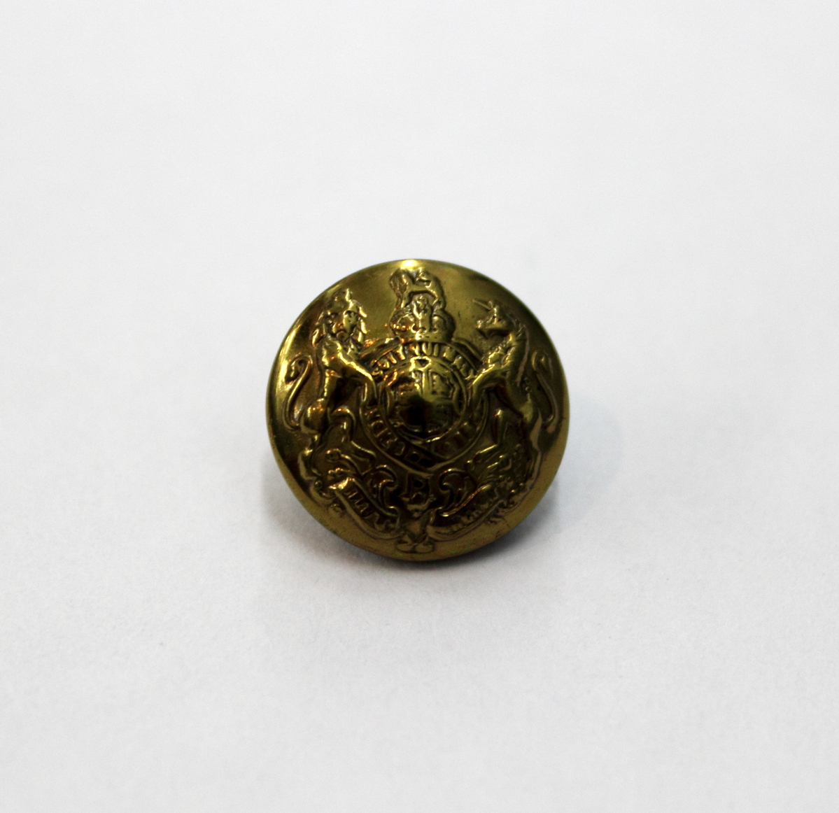 Brass circular button with metal, thread and fabric attachment in back. Button is brass, with raised relief of British Royal Coat of Arms.
