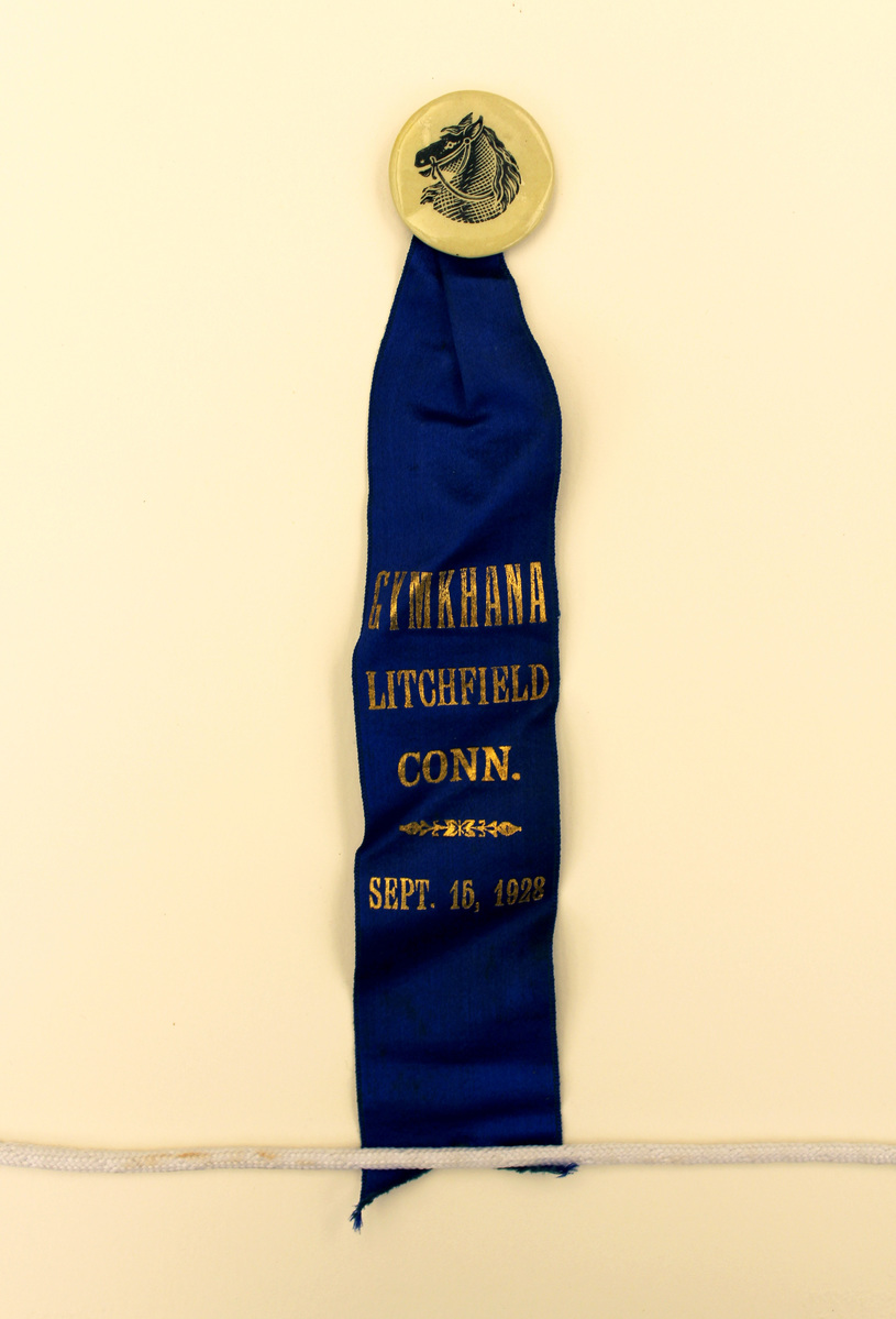 Rectangular ribbon of blue satin with notched bottom. Ribbon is bunched at top, where it is attached to a round metal button. Button has a white face with black printed image of a horse's head; straight pin on reverse. Printed on one side of ribbon in gold lettering, "GYMKHANA/LITCHFIELD/CONN./SEPT. 15, 1928."