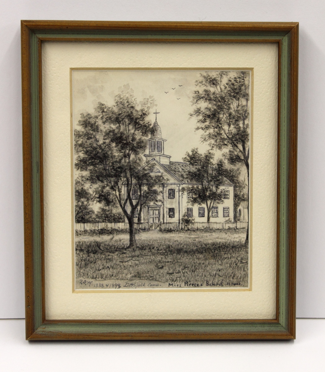 Framed pen and ink drawing of the Litchfield Female Academy building. View shows northeast corner of building. Federal style building with columns on front. Shutters closed on all but four windows. Fence in front with a few trees. Behind Academy building is a smaller outbuilding. Cupola on top of building, hip style roof. Signed in lower left corner "Z.S.W./1838 & 1898. Litchfield, Conn./Miss Pierces School House" in ink.