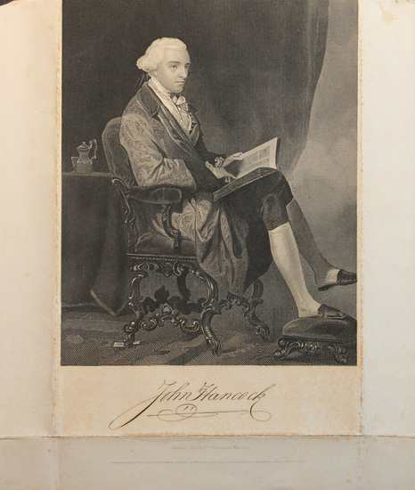 Black and white engraving of a man in 18th century clothing seated in a chair facing left. Sitter has feet rested on a foot stool and has a book open in his lap. "John Hancock" printed below portrait.