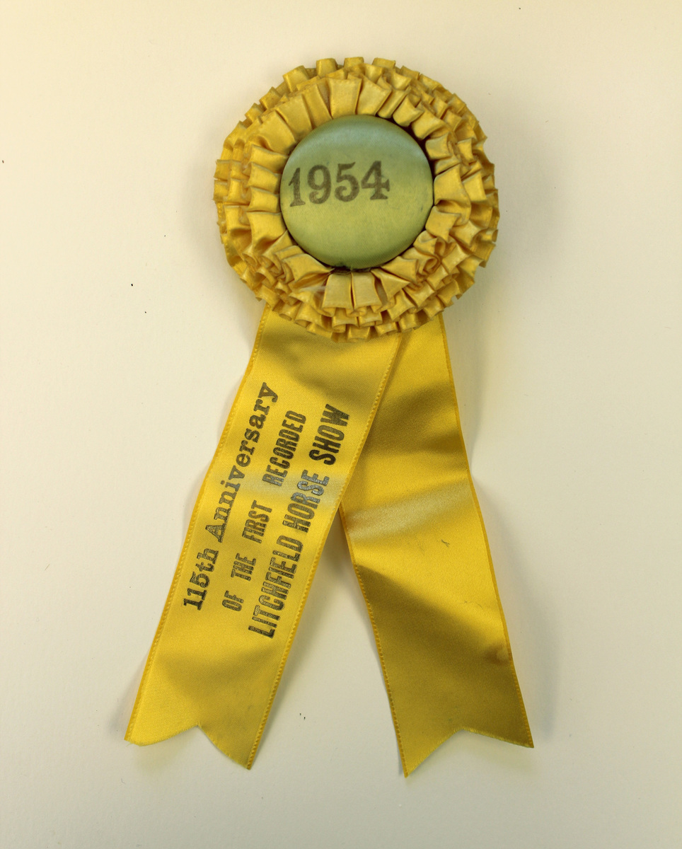 Yellow satin ribbon with rosette of yellow satin on top, circular button in center. Button stamped at center in gold lettering, "1954." Two satin tails extending below rosette; left tail stamped with gold lettering, "115th ANNIVERSARY/OF THE FIRST RECORDED/LITCHFIELD HORSE SHOW." Metal hook on reverse with blue and white paper label for Pegasus Sales Co., New York, NY.