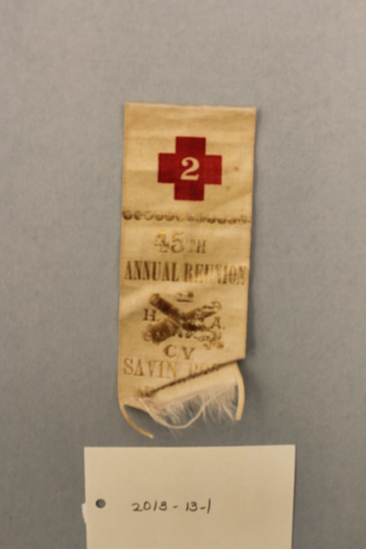 Ivory silk G.A.R. reunion ribbon. Printed red across with "2" inside at center. Gold printed band: "45TH / ANNUAL REUNION / 2 CVHA (around crossed cannons) / SAVIN ROCK / AUG. 24, 1910." Bottom of ribbon cut up sides of the bottom and fringed. Paper sticker label on back.