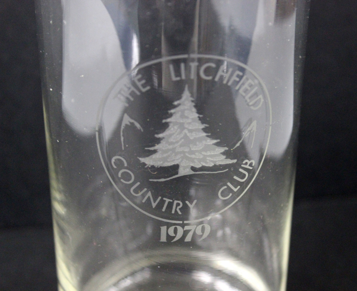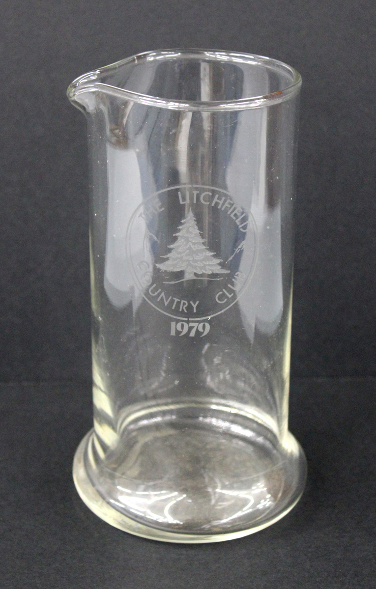 Glass pitcher won by donor at the Litchfield Country Club as an award. Straight sides, flaring at base. Round rim with short spout. Etched on one side, "THE LITCHFIELD/COUNTRY CLUB" set in circle around image of an evergreen or pine tree; "1979" etched underneath.