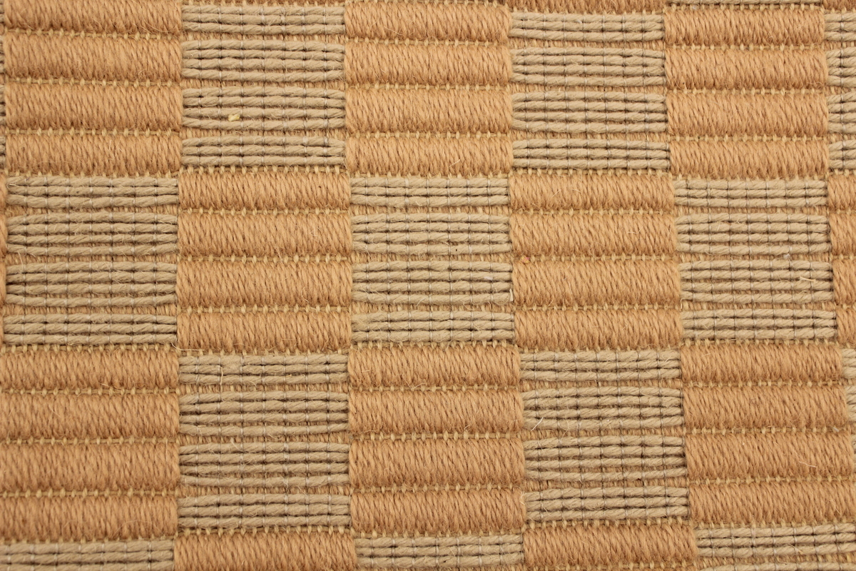 Rectangular piece of carpet sample. Gray and light brown checkerboard pattern. Tan squares are divided into quarters by horizontal tan stitching. The gray squares have horizontal lines of thick gray yarn and are divided into quarters by horizontal lines of the light brown background. Vertical gray stitching holds the gray yarn in place. Carpet has open weave and is very rough and thick to the touch.