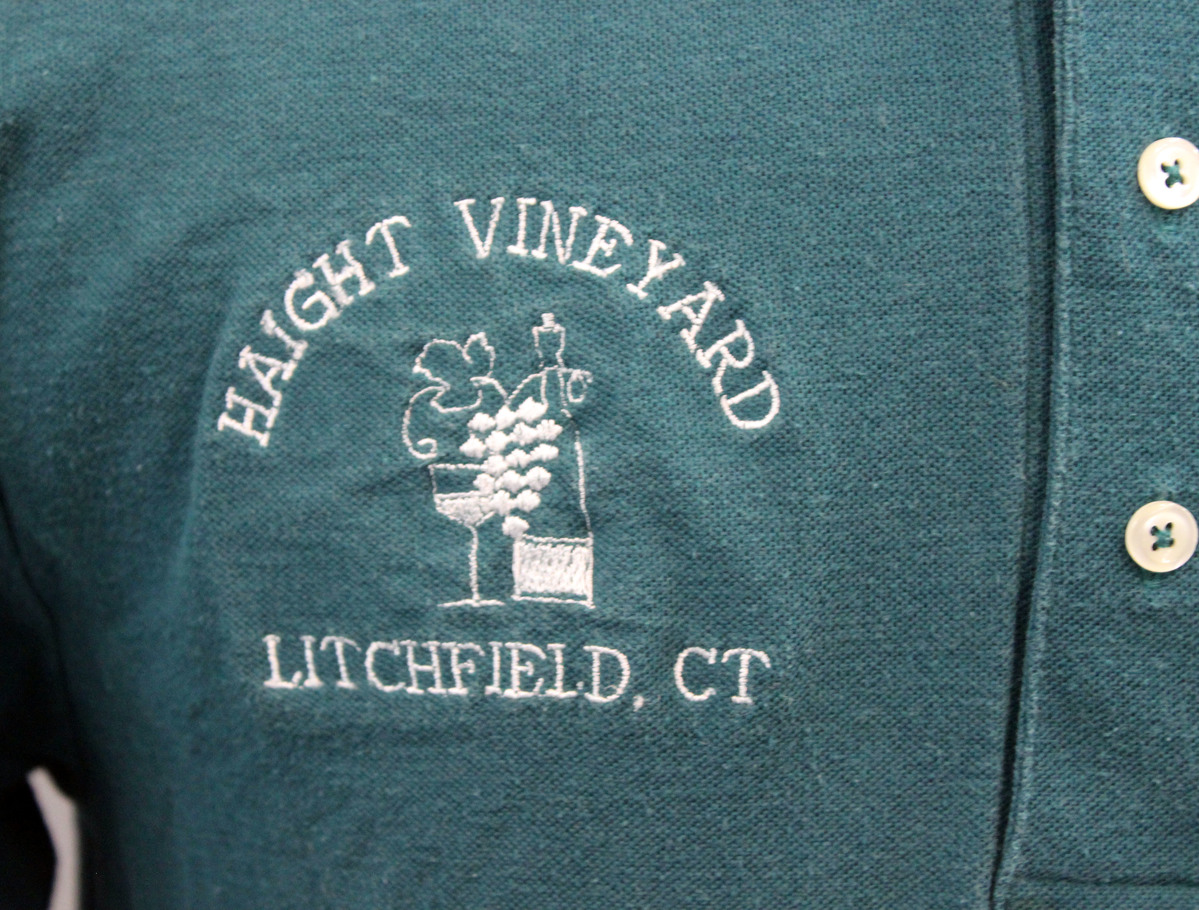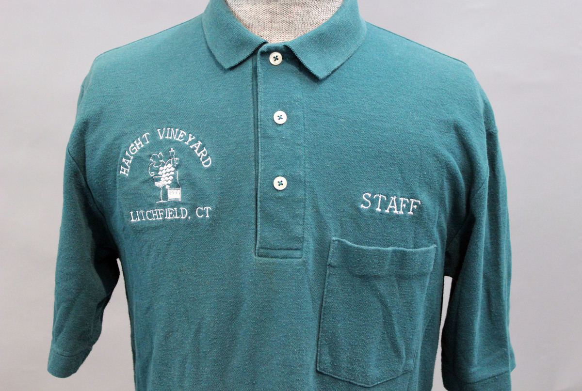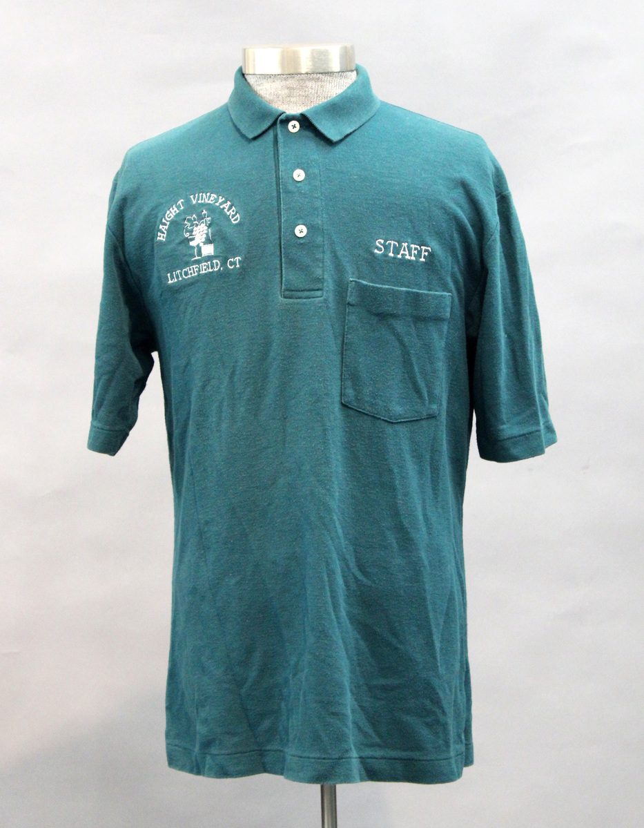 Dark green polo-style shirt with short sleeves. Ribbed fold-over collar, open partially down center-front with three buttonholes and white buttons. Flat chest pocket on left side with white embroidered letter, "STAFF." White embroidered logo of wine bottle, wine glass, and grapes with lettering, "HAIGHT VINEYARD/LITCHFIELD, CT" on right side. Green woven label at center-back of neck with white lettering, "OUTER BANKS." White woven label with green lettering, "50% POLYESTER/50% COMBED/COTTON/M/MADE IN U.S.A./REV. FOR CARE" with care instructions on reverse.