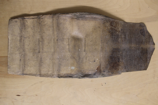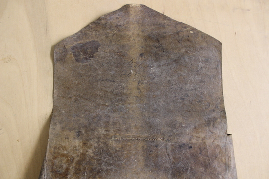 Leather document case for promissory notes (kept in archival collection) written to Preston Parkhurst. Also called a bill sorter. Leather case with seven compartments for letters or bills, labeled with alphabetical sections. Top flap labeled with the name Parkhurst, in ink, along with what may be remnants of an address.