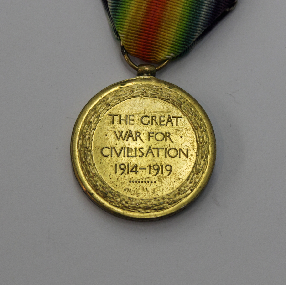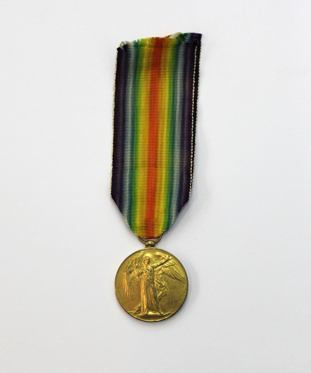 Round bronze medal with silk rainbow ribbon. On obverse of medal, raised relief of winged angel wearing toga, breast plate and wreath with one arm outstretched and the other holding a branch. At base, small inscription that reads: "W. McM". On reverse, circular wreath border with lettering in center that reads: THE GREAT/ *WAR FOR*/CIVILISATION/1914-1919/*********". Inscription along rim reads "Capt. J.O. Taylor". World War I Victory Medal.