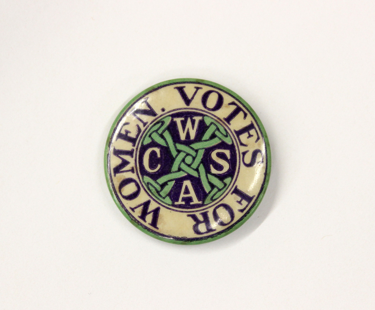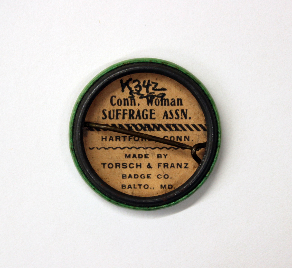 Round metal button with pin and catch on reverse. White front with light green and purple border. At center, circular logo with a purple background and white lettering "C/W/S/A" separated by an X-shape of green knotwork. In purple lettering around logo, "VOTES FOR WOMEN." Paper label inset into reverse, with printed lettering, "Conn. Woman/SUFFRAGE ASSN./HARTFORD, CONN./MADE BY/TORSCH & FRANZ/BADGE CO./BALTO., MD."
