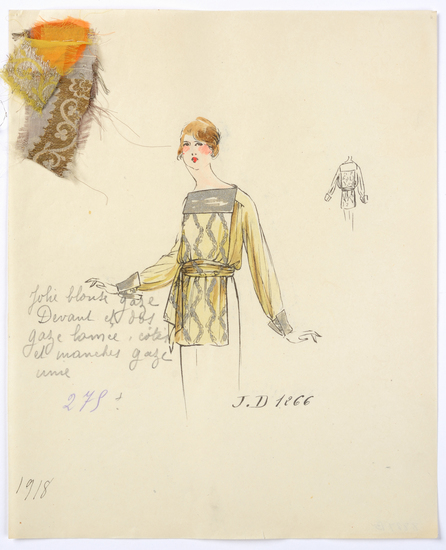 Lithograph and watercolor on paper fashion design. Gauze blouse with front of woven and gold lame. Fabric samples accompany rendering.