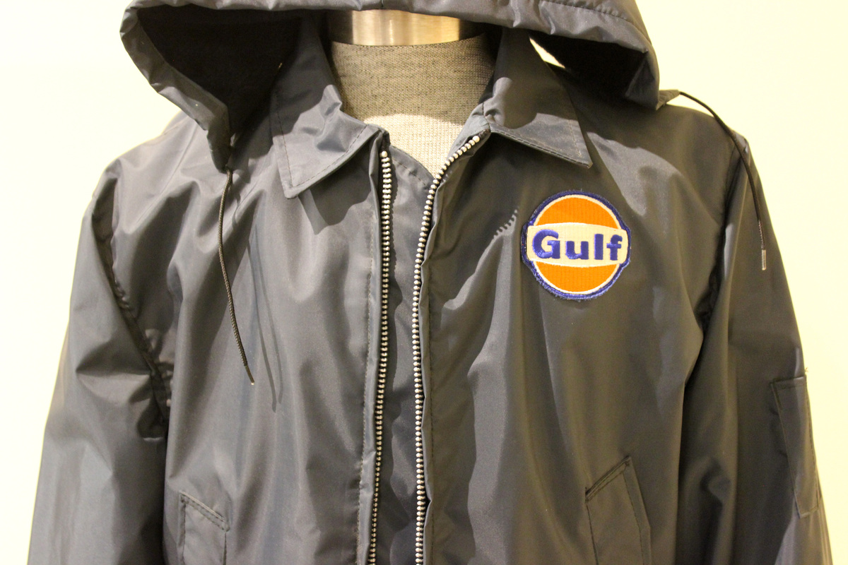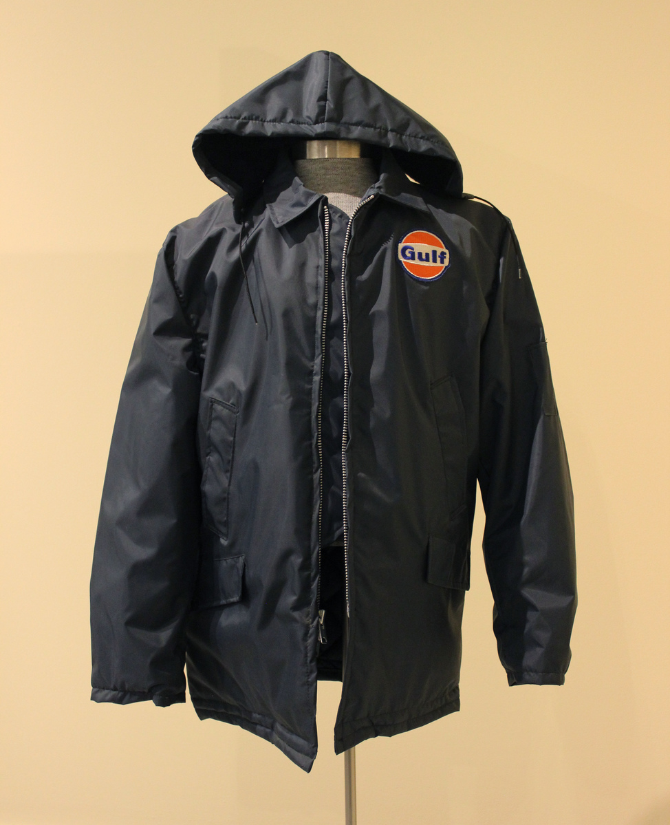 Light navy waterproof men's jacket (a) with detachable hood (b). Spread collar, center-front zipper. Four flap pockets. Round orange, blue, and white embroidered patch with lettering, "GULF." Pencil pocket on left sleeve. Lined with navy fur and quilted fabric. Two labels at center-back: woven "Marine Clothing Co., Inc., Uniforms/Boston, Mass." label with nautical flags; and non-woven paper with text "POLARMATE" and fiber content and care instructions. Loop at center-back. Attached, zippered matching hood lined with navy fur.