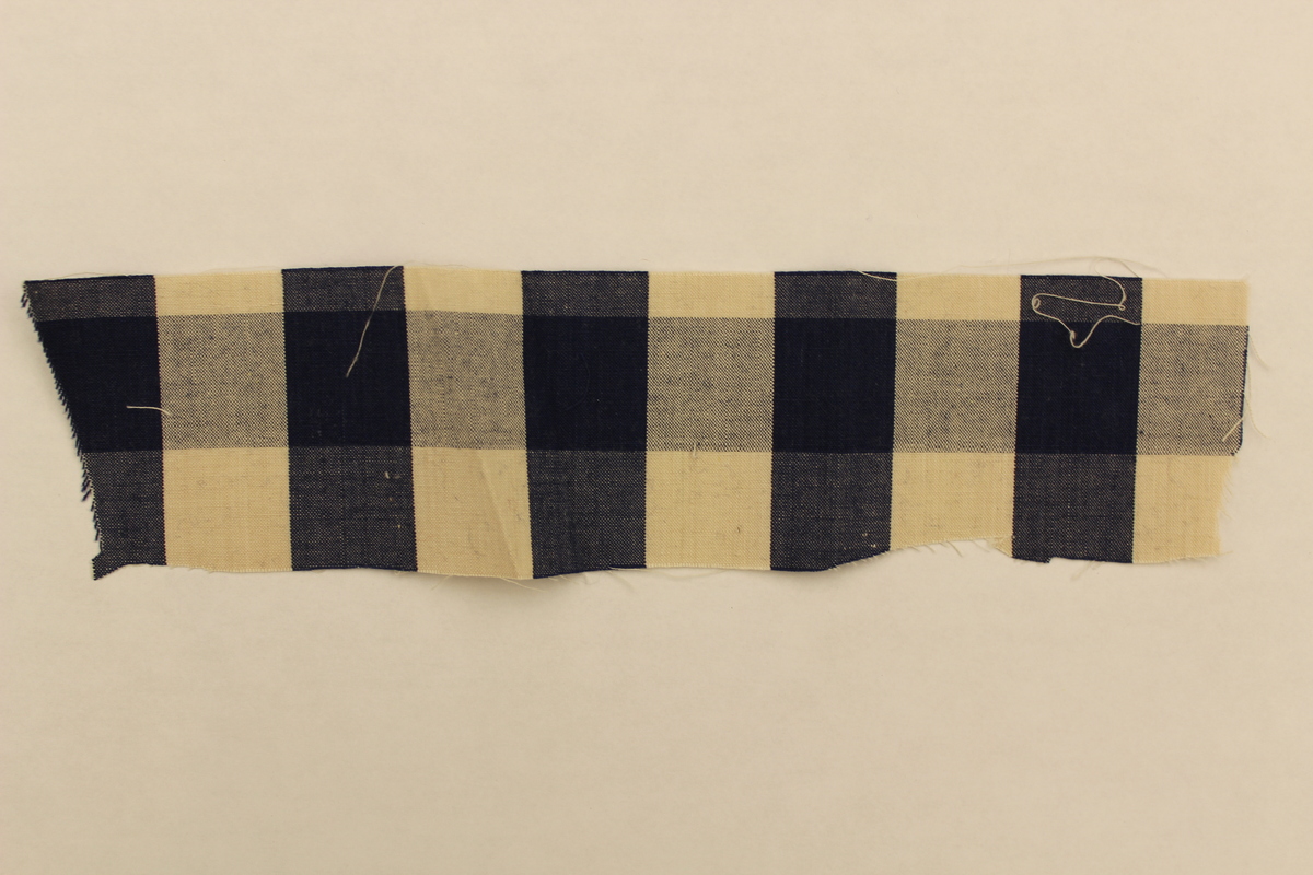 Rectangular fabric swatch made of synthetic materials. Large blue and white plaid pattern. All squares are of equal size. Fabric is rough to the touch.