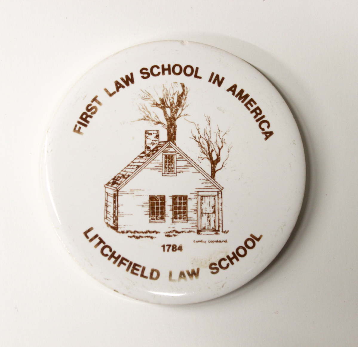 Souvenir coaster with image of Litchfield Law School. Round ceramic coaster with white glaze and printed image. In brown lettering, "FIRST LAW SCHOOL IN AMERICA/LITCHFIELD LAW SCHOOL" set around image of a wooden, 1 and 1/2 story, front-gabled structure with a single chimney and multi-pane windows. In smaller brown lettering underneath, "1784" with artist signature, "Cindy Copeland." Thin, circular cork layer adhered to bottom.