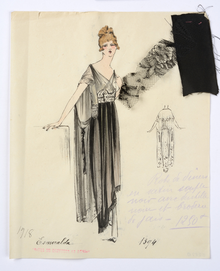 Lithograph and watercolor on paper fashion design. Dinner dress in soft black satin with black lace and jet embroidery. Fabric samples accompany rendering.