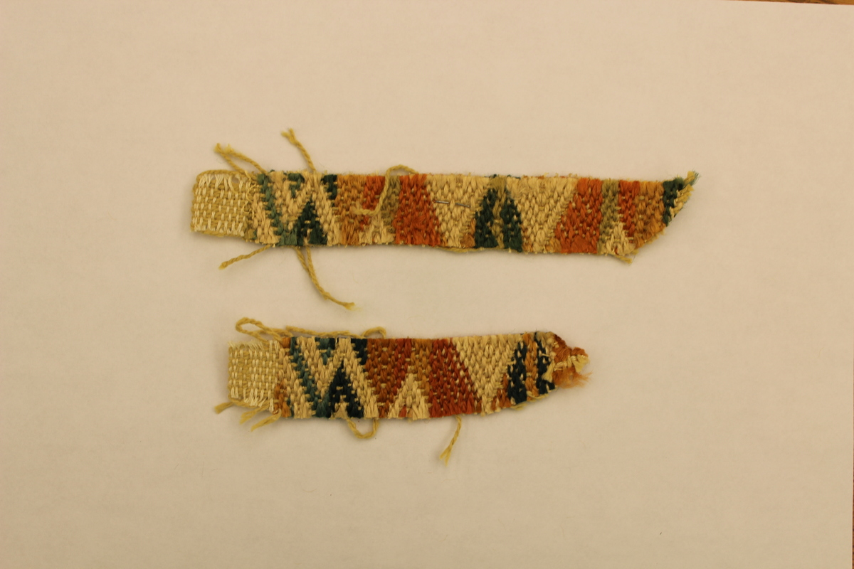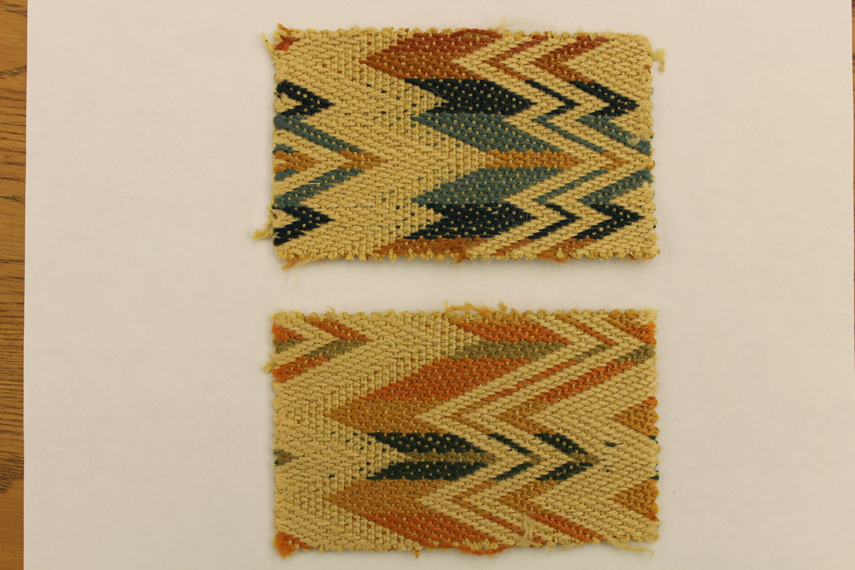 Rectangular fabric swatches made of 71% rayon and 29% cotton. Background is tan with a zig-zag pattern of differing widths. Swatch a: Colors are orange, dark blue and light blue. Swatch b: Colors are yellow, dark green and light green. Swatch c: Colors are orange, yellow, dark and light green. Swatch d: Colors are orange, dark and light blue. Fabric is thick, has an open weave and is rough to the touch.