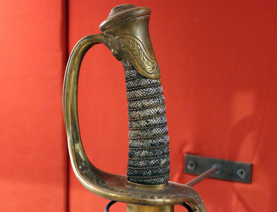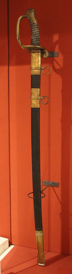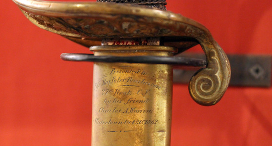 Civil War era sword and scabbard. Scabbard is leather with flanged brass tip. Two brass bands at top - both with rings attached. Upper band has inscription that reads, "Presented to/ Fife Maj. Peter Tomlinson/ 27th Regt. C.V./ by his friend/ Charles A. Warren/ Watertown Oct. 20th 1862." Sword made of iron. Blade engraved "Tiffany & Co./ New York" near hilt. Blade has two grooves - one thin, one wide. Part way down is the great eagle of the U.S. On reverse side, letters "P.D.L." and "E" near hilt. Above them is "Guaranteed to cut/ wrought iron". Blade also embellished with a "US" engraving. Hilt of the sword is brass with a curved handle with single closed knuckle-bow, slightly disked guard with open scrollwork and single small down turned quillon. Handle is wood wrapped with wire and a very open weave textile. Brass pommel with scrollwork and initials "PT">