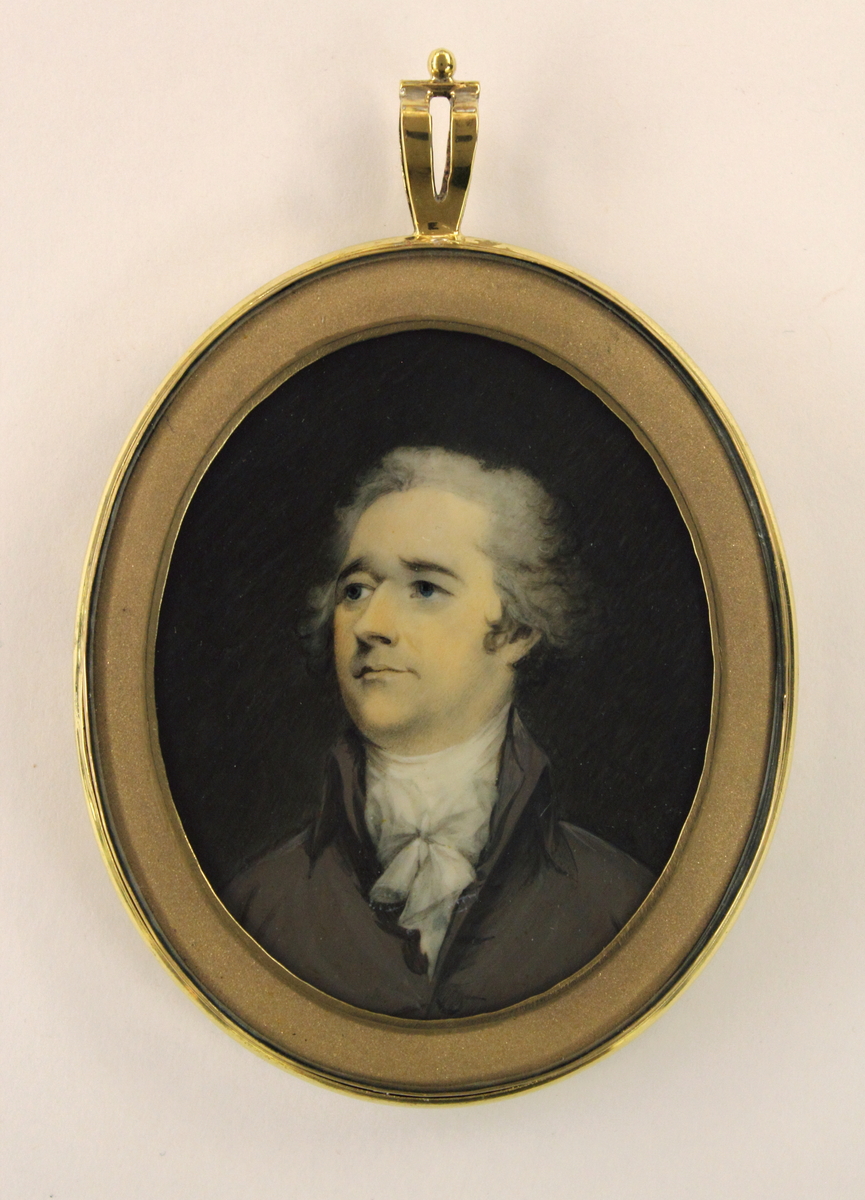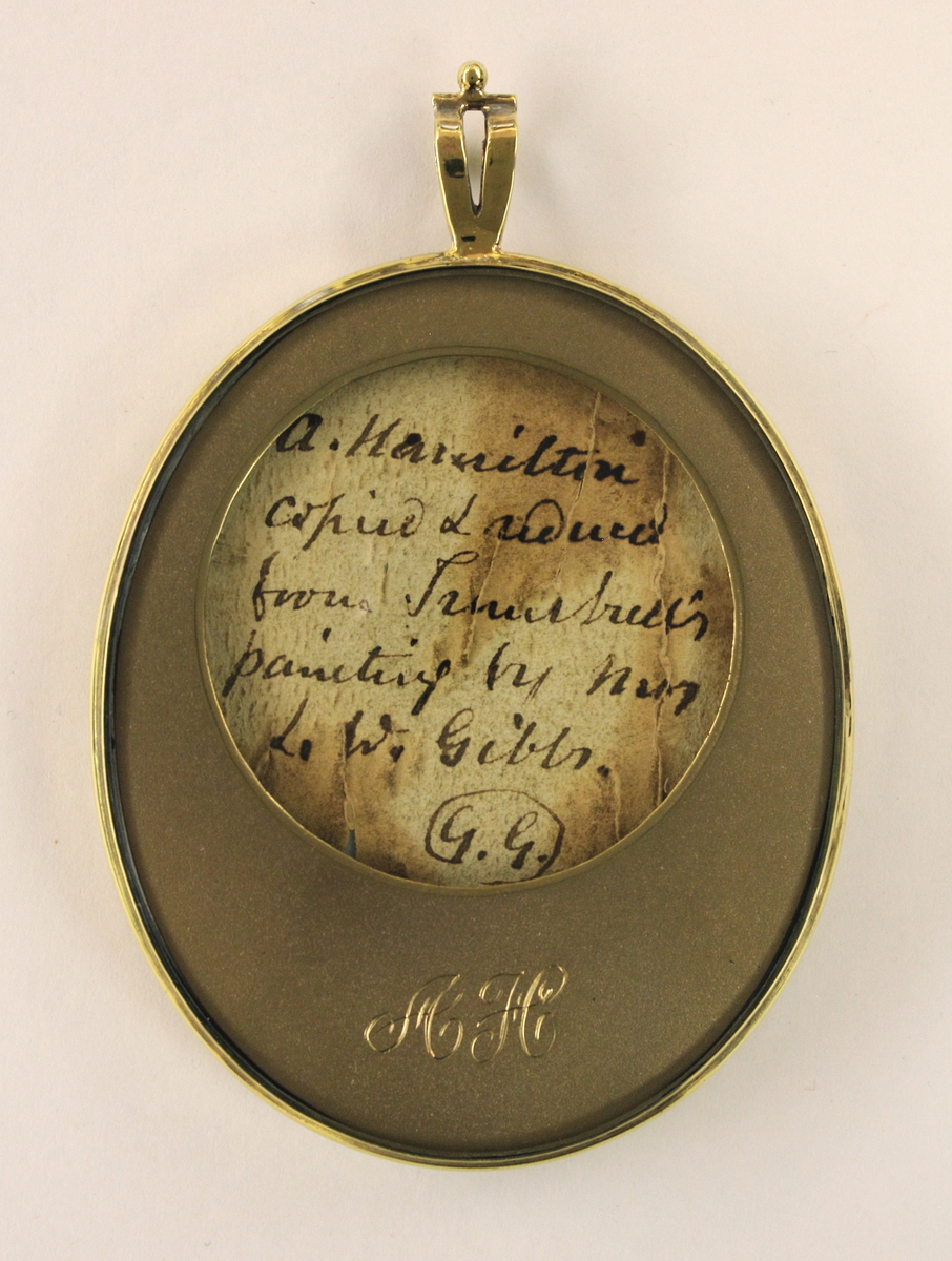 Watercolor on ivory portrait miniature of Alexander Hamilton (1757-1804). Head-and-shoulders portrait of Hamilton wearing a grey jacket with white cravat. Facing left, with blue eyes and powered hair. Set against a dark grey and blue background. Paper backing on ivory miniature with handwritten inscription, "A. Hamilton/copied & reduced/from Trumbull's/painting by Mrs./L.W. Gibbs/G.G." Miniature is framed in a reproduction, gold metal locket, under glass. Locket reverse has a second piece of glass to allow for viewing of the inscription on the ivory reverse.