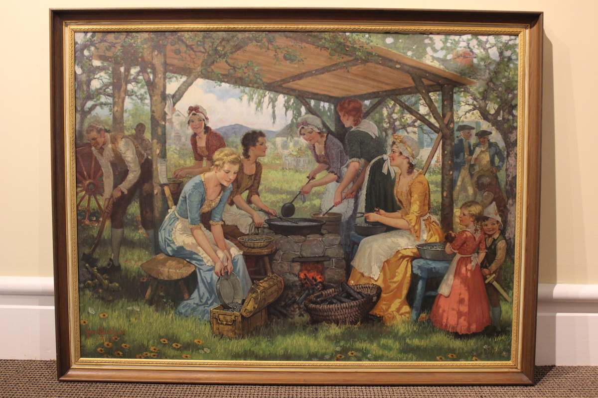 Sunny summer scene of people crafting lead musket balls under a wooden structure outside. Six white women are placed in the central foreground, three sitting, three standing. They are pouring molten lead into molds, cooling the molds, snipping the lead overpour off of the musket balls, and pouring finished musket balls into a trunk. All are dressed in bright colonial revival gowns. Baskets and bowls of balls can be seen around the central fireplace. A basket of wood sits on the ground in front of the fire. Two white children, one boy and one girl, are also standing in the foreground on the right side. The girl looks at the women working while holding a doll. The boy, just behind the girl, has a paper hat and wooden play sword looks off the canvas to the right. Five men are placed in the background, two on the left, three on the right. The leftmost white man is holding an axe, splitting up a yellow-ish shape. He is dressed in a colonial fashion, with buckle shoes, stockings, a tan waistcoat, and white shirt with a ruffle at the neck. Behind him at a distance is another man of unknown ethnicity wearing a brown shirt, working near a large red wagon wheel. On the right two white men dressed in blue military coats, tricorn hats, yellow waistcoats and pants, and ruffles at the neck. They are looking at papers they hold in their hands. Sitting in front of them is black man in a brown shirt and red vest, working on a yellow chest.