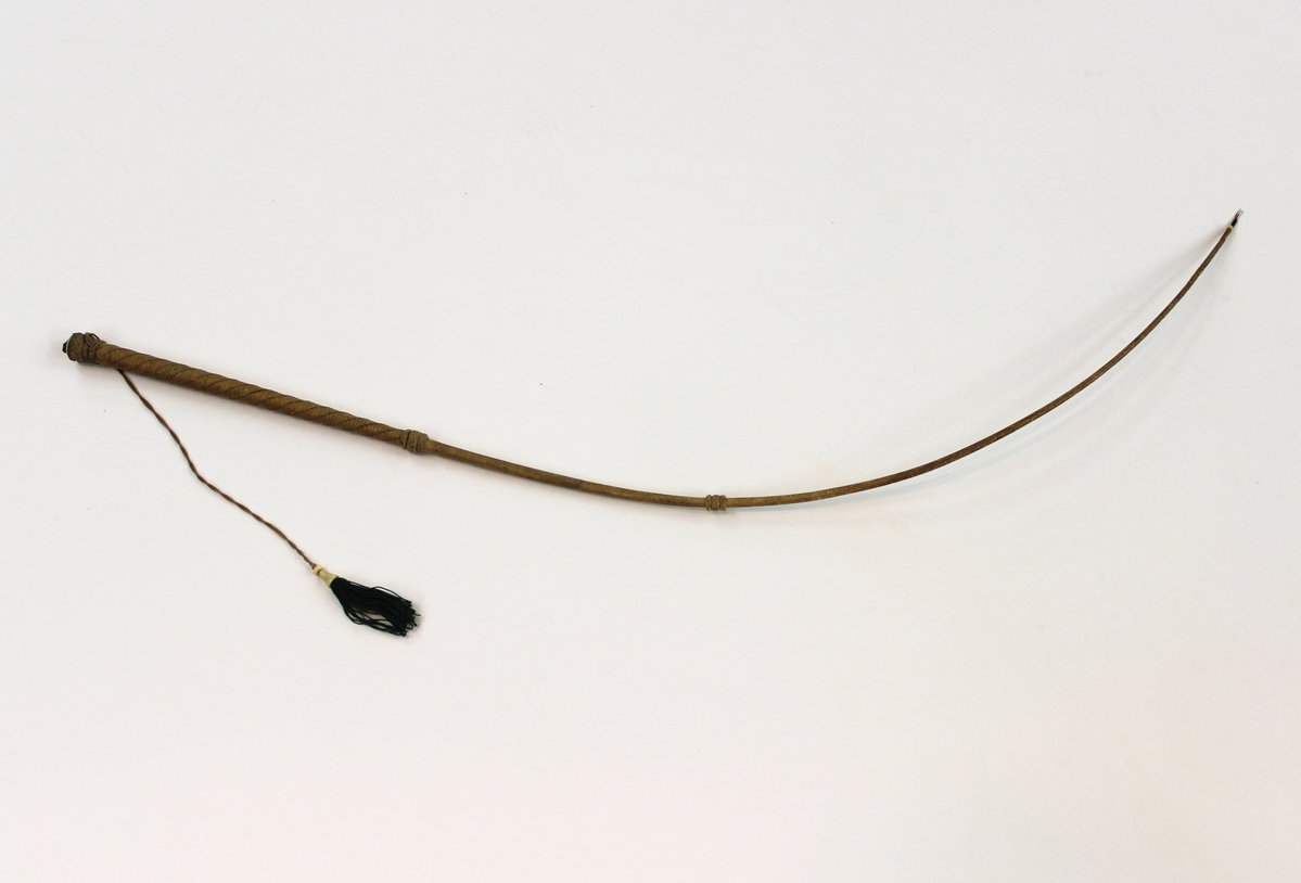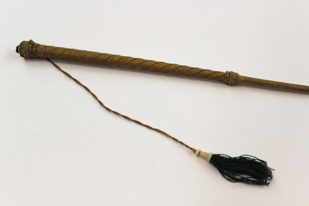 Intricately braided cotton thread over natural crop (possibly cane). Bead-shaped knots halfway down crop and at the end of the handle. Handle is thicker and has thread diagonally woven over cotton base. Crop handle terminates in another knot with a circular ivory disc attached at the end; long cotton thread attached above knot with ivory bead and green silk tassel at the end.