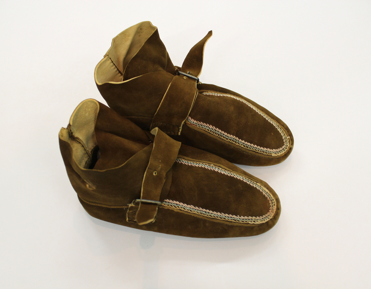 Pair of brown suede child's moccasins; pointed toes; decorative stitching along front seams in pink, blue and yellow; strap closure with metal buckle; unlined
