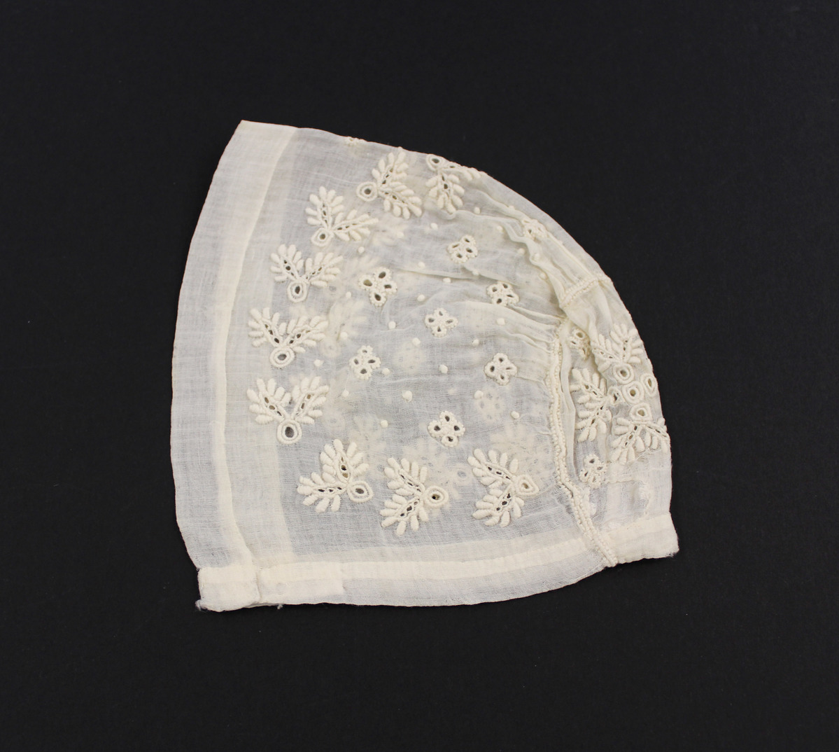 Off-white sheer cotton child's bonnet; embroidered circular section at back; embroidery