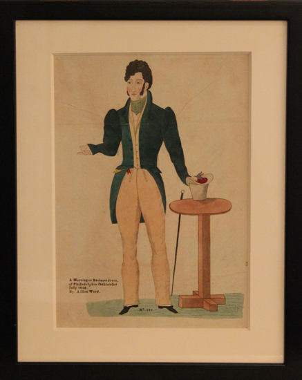 Hand colored lithograph of a gentleman. The subject is standing beside a small circular table with his right arm out gesturing to the right. He is wearing trousers, vest, shirt, cravat ,and coat. Placed on the table under his left hand are a top hat and gloves. A walking stick is leaning against the table as well. Below the gentleman is printed "No. 121". Along the left side of the page is printed "A Morning or Business dress,/ of Philadelphia fashion for/ July 1830./ By Allen Ward."