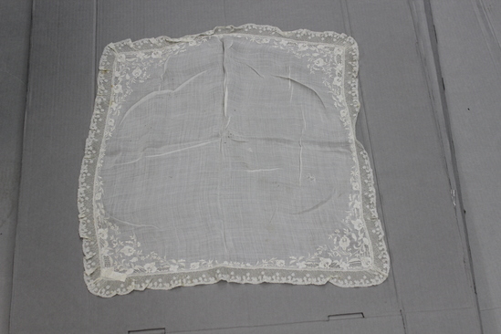 White cotton handkerchief. Solid center. Rounded corners. Embroidery work along edge with more elaborate design in each corner - floral design with drawn work areas. Lace border, net ground with pattern of clustered circles along edge.
